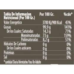 Extra Virgin Olive Oil, cold-extraction, unfiltered. Made from the first selected olives of the harvest. Acidity 0,09 º.